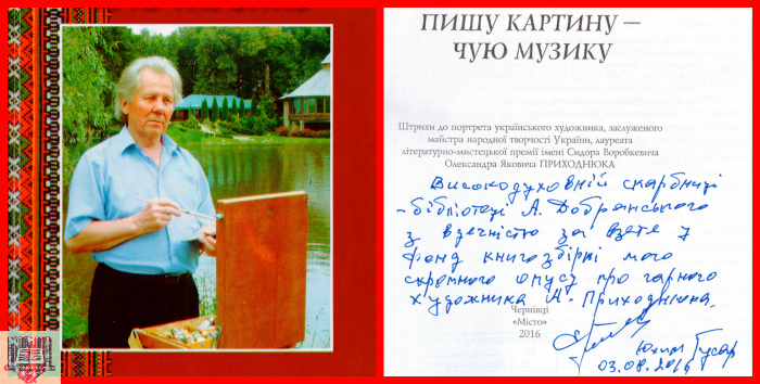 Нинішня збірка Пишу картину – чую музику – про життя і митецьку діяльність українського художника, члена Національної спілки майстрів народного мистецтва України, заслуженого майстра народної творчості України, лауреата літературно-мистецької премії імені Сидора Воробкевича Олександра Яковича Приходнюка.