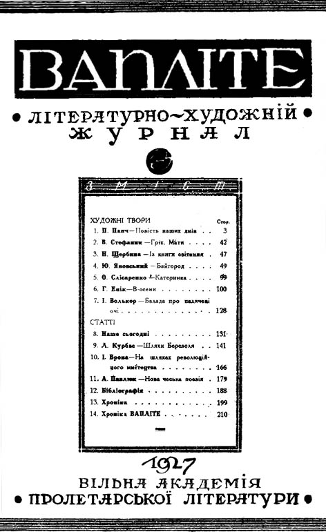 Активний і харизматичний Микола Хвильовий заснував ВАПЛІТЕ (Вільну академію пролетарської літератури), яка проіснувала з 1926 по 1928 роки, куди увійшли Михайло Яловий, Микола Куліш, Микола Бажан, Майк Йогансен, Павло Тичина, Юрій Яновський та інші. Видав 5 чисел однойменного журналу “Вапліте”, 6-те ж число було конфісковане через уривок ідеологічно ворожого роману “Вальдшнепи”. Митці намагалися створити нову українську літературу, використовуючи найкращі досягнення європейської літератури. Ваплітяни виступали проти шовінізму й ідеалізували революцію 1917 року, яка обіцяла національне самовизначення і проголошення свободи народів.